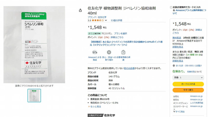最初にネット通販サイトで購入しようとした人は(サイトの)写真が古いままでも商品説明でぶどうに使えない事に気付けるかもしれませんが、amazonを最初に見てしまった人はそのまま購入してしまう人が多い気がします(だってジベレリン=ぶどうのイメージあるんだもん)