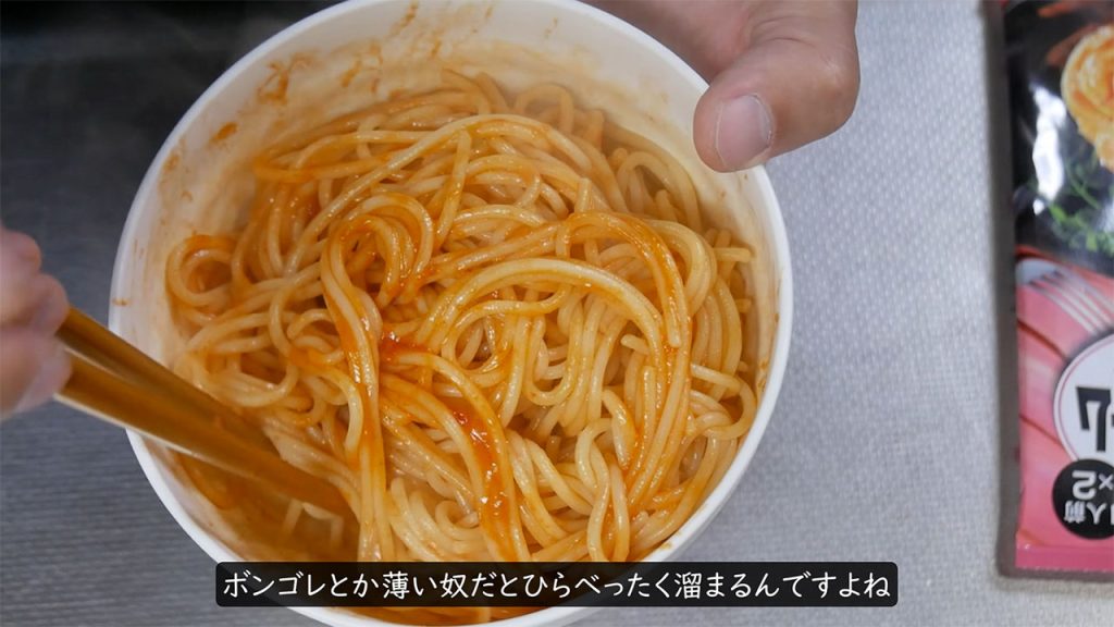上の写真は水が少ないですが多めで火も強めでやった方がパスタの食感が良くなり美味しいです。