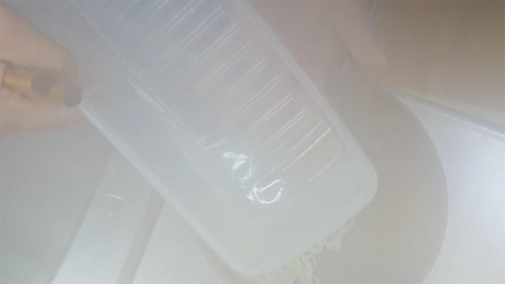 パスタが希望の状態になったら電子レンジ用の容器とフライパンをパスタだけ行き来させて水を切ります。