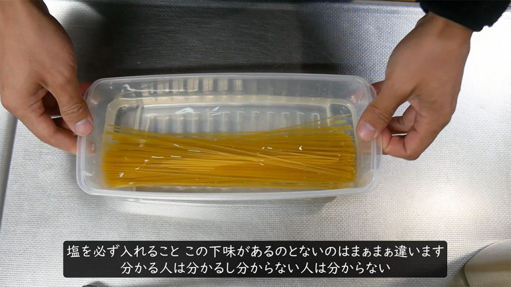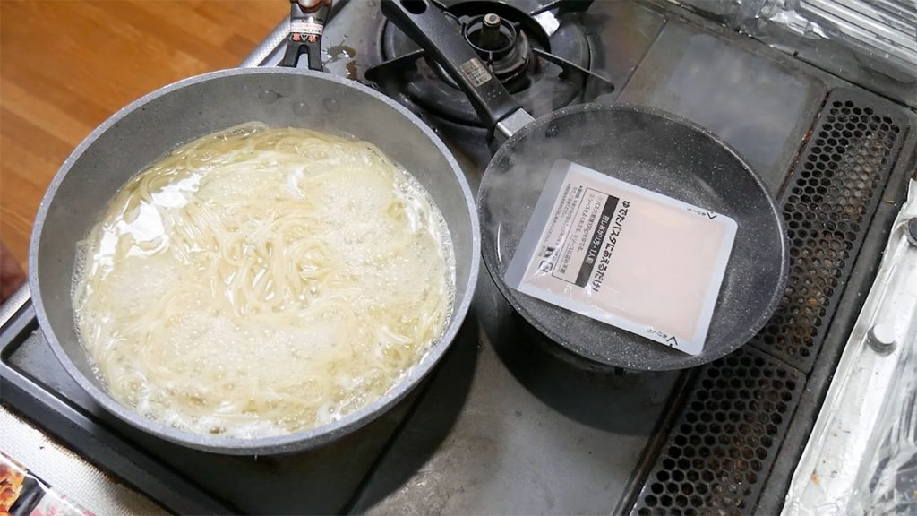 具体的にやり方を説明していきます、最初から鍋(フライパン)でやってもいいですがフライパンが小さいとパスタ(スパゲッティ)にムラが出来がちなので私は最初はパスタを電子レンジで作る容器で暖めてから最後にフライパンで茹でるようにしています。
