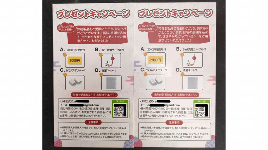 さてこの着る電気毛布ですが、同じ商品が他の業者からもいっぱい販売されています、それもあって商品の中に「プレゼントキャンペーン」なる物が入っていました。(まぁ中華製品ではよくあるんですが)