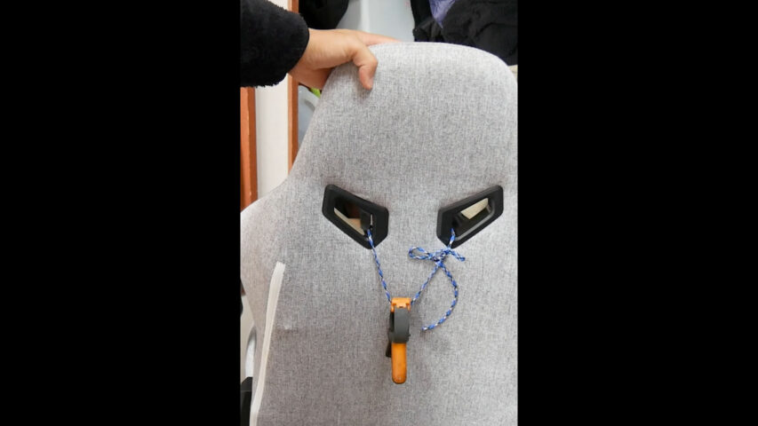 勿論ヘッドレスト(ネックレスト)が有るのですが、上下の高さがほぼ固定なので当たり所が悪くて使えません、腰用のクッションは上下できるように穴(上の図右下)が上下に開いていて位置調整ができるのに、何故ヘッドレストは横に穴を開けたのか…