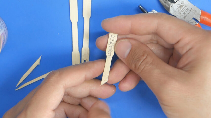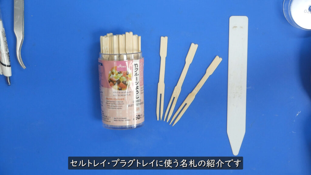 128穴のセルトレイ(プラグトレイ)に使う名札(ネームプレート)が丁度いいサイズがamazonでもダイソーでも売って無くて何か代わりになる物を探していたのですが丁度いいのが有りました、ダイソーで売っている「竹フルーツようじ」です、ちなみに画面右の樹脂製の看板はダイソーの園芸用の物。