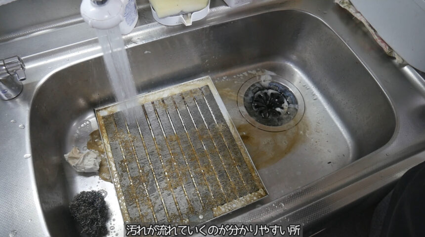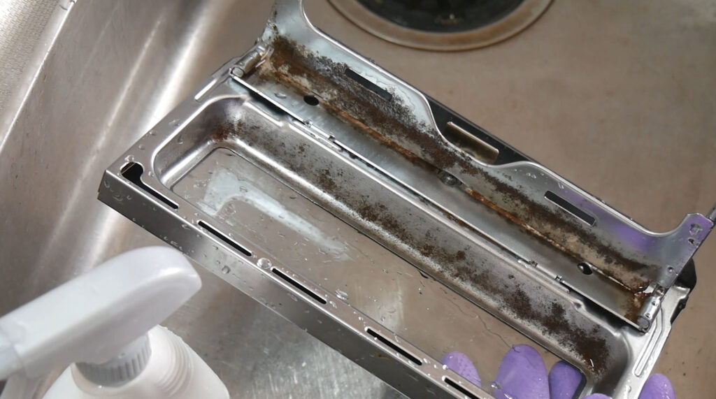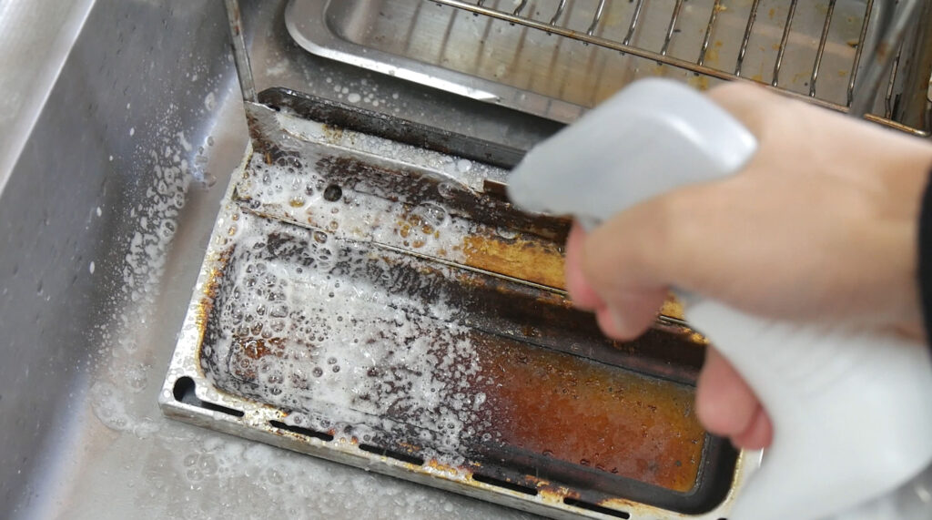 スプレーしてすすぐだけでかなり落ちますが、厚みのある汚れやサビはそれだけでは落ちないのでスチールタワシで擦り洗いします