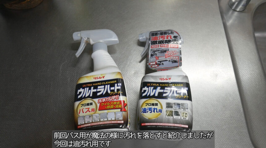 この間リンレイウルトラハードクリーナーの『バス用』が魔法の様に落とせなかった石鹸や皮脂汚れなどを落とせると紹介しましたが今回は『油汚れ用』です
