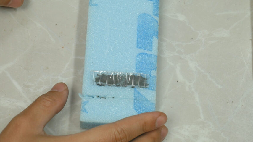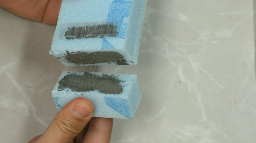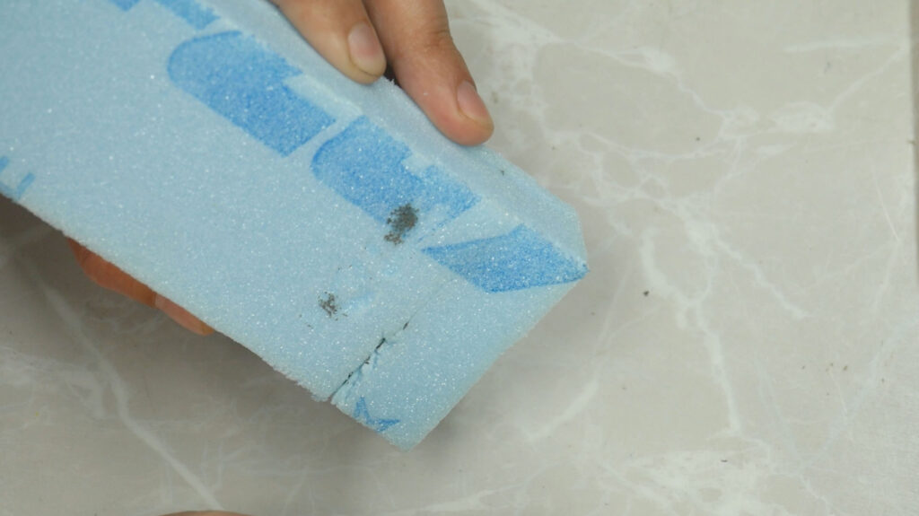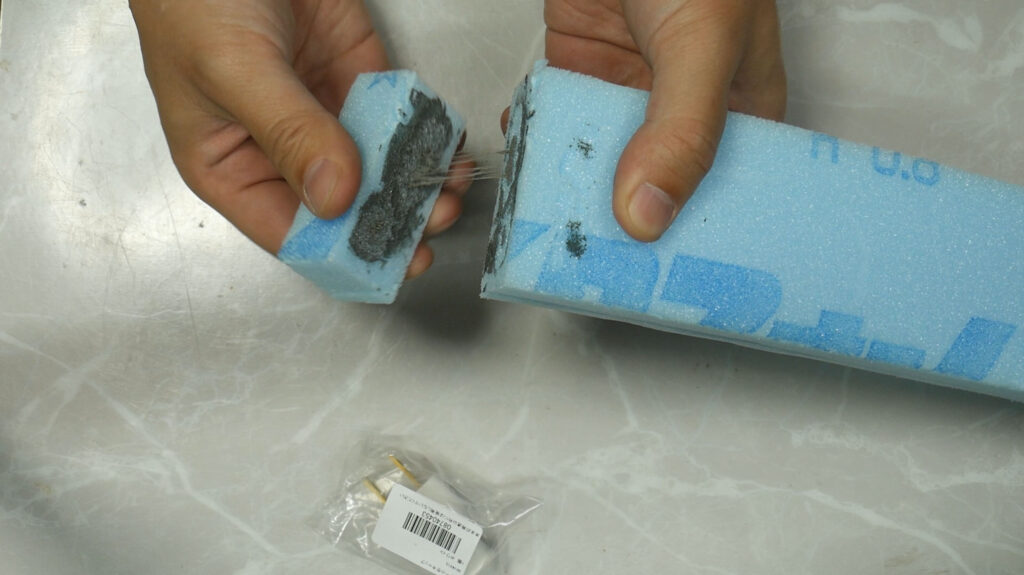 接着から24時間後、まだ完全には硬化していないもののスタイロフォーム同士もがっちりとくっついていた、スタイロフォーム自体の強度の関係で接着には限界がある模様