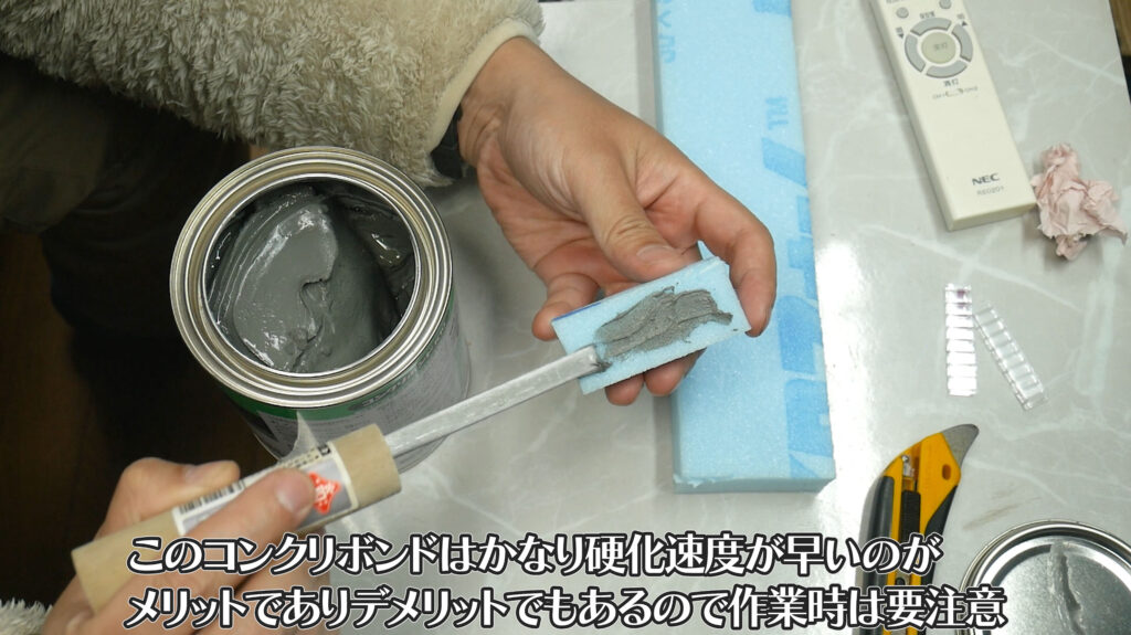 続けて2枚目、コンクリボンドは硬化が早く粘着性が高く貼り付けやすいが、急がないと表面が硬化してしまう