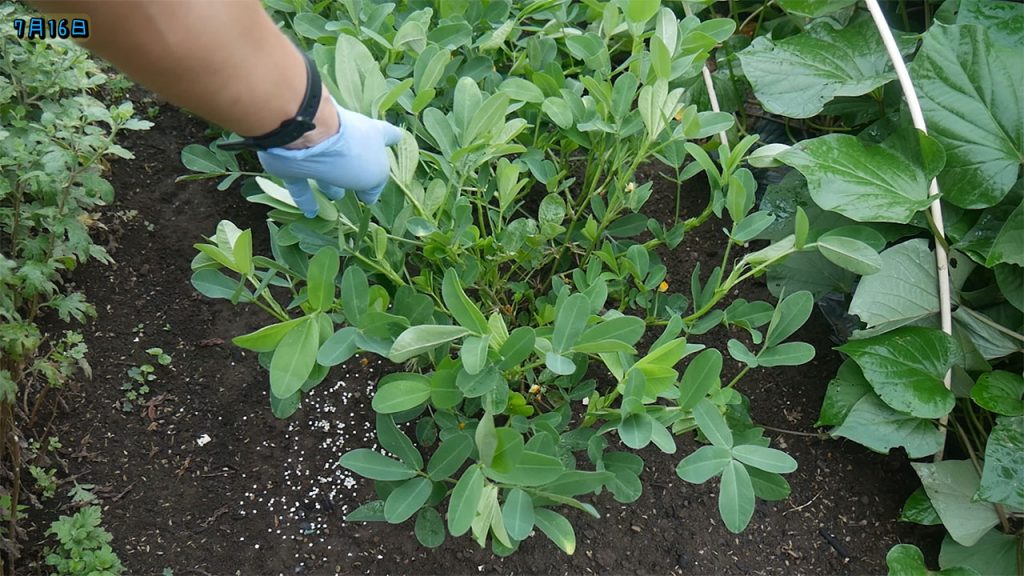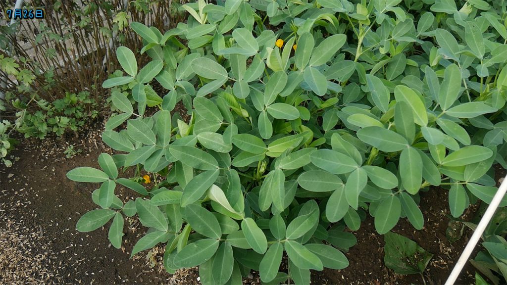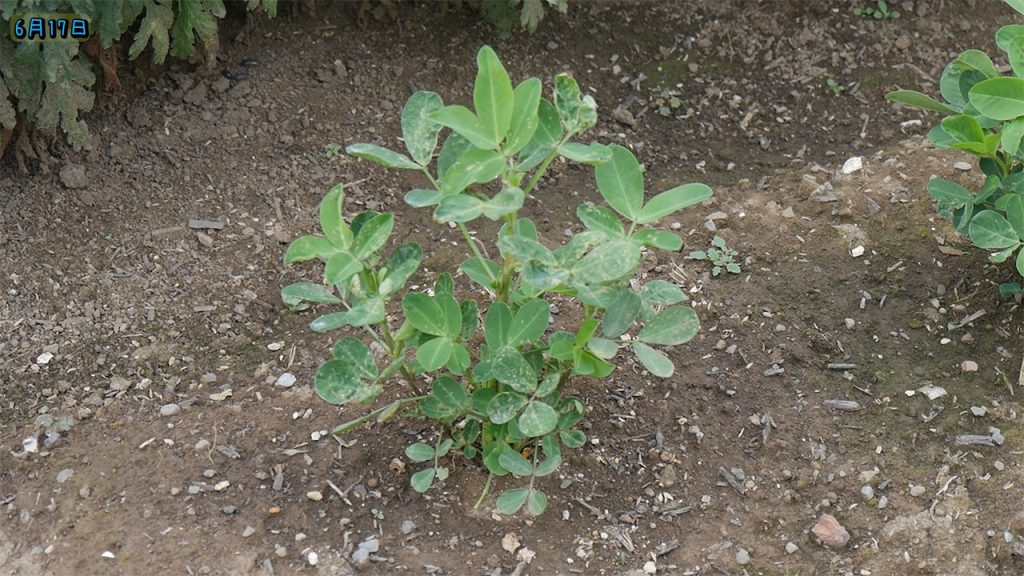 落花生は花が咲いたらその花の部分が下(土)側に潜り込んで土の中でよく見る形のピーナッツになります、今回は開花して土に潜り込んで~という流れを撮影していないので部分的となります。