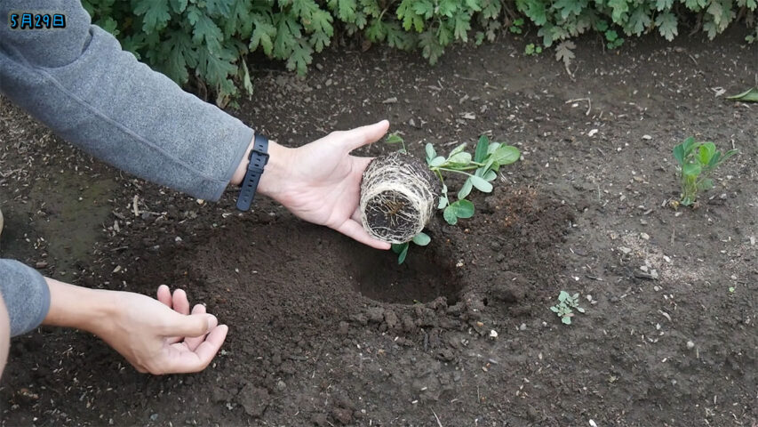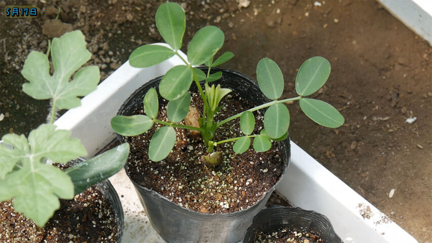 ポリポットで育苗、半分に割れたピーナッツが見えます。