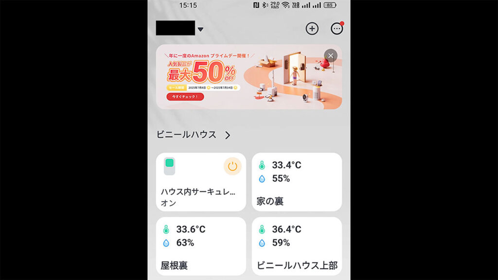 屋根裏の温度の計測にはswitchbotの防水温湿度計を使っています、ハブを買う事でビニールハウスの換気扇を温度をトリガーにして自動でOn/Offしたりしています。