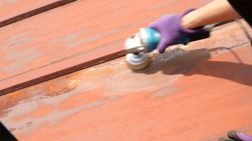今のトタンにそのまま塗装したのでは剥がれてしまうのでケレン作業といって汚れや錆びを取ったり塗装を傷つける作業をします、それにより塗装が食いて剥がれずらくなります。