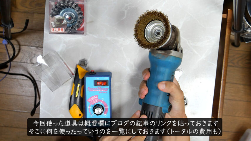私のグラインダーは速度調整が出来ないのでスピードコントローラーが必要になります、屋根の上でフルパワーだと事故の時に怖いですし完全なケレン作業は求めていないので最弱で使いました。