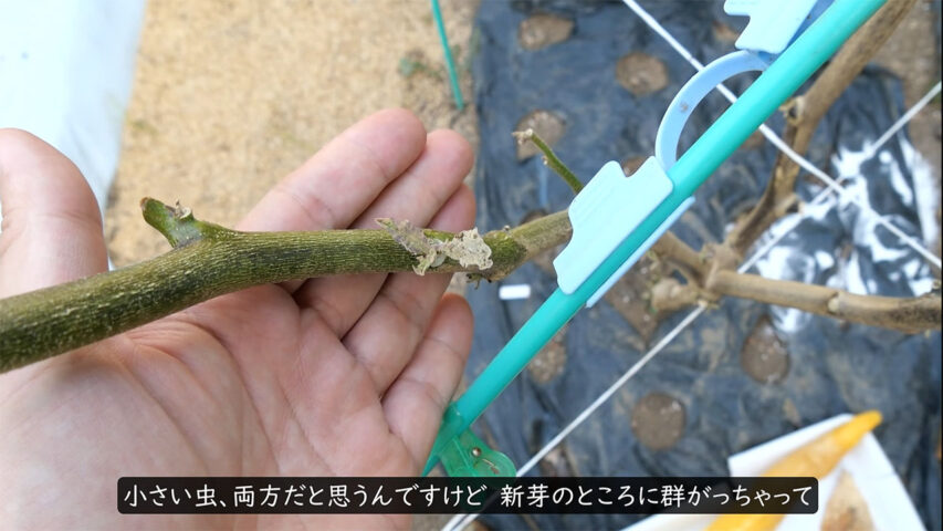 その状態で更新剪定をしてしまうと、株に残った害虫たちが、一番柔らかく栄養のある新芽の部分に集中してしまい、一斉に食べられてしまう危険性が極めて高いです。