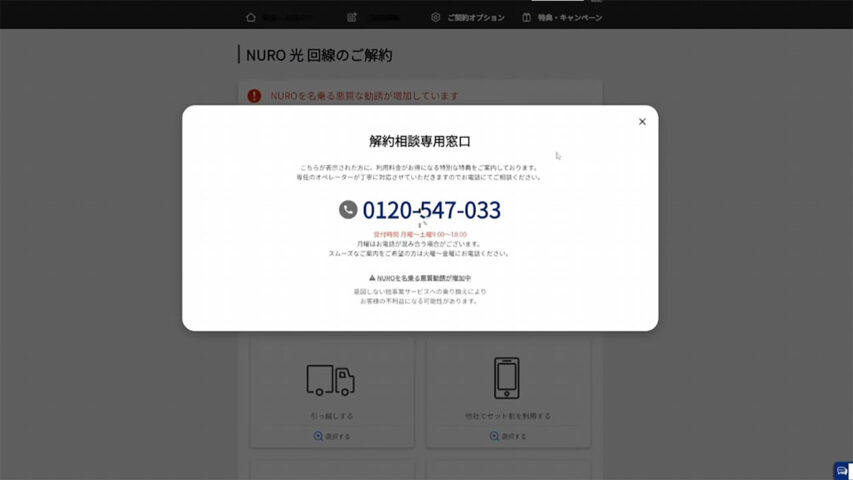 仕方なく「NURO光を解約する」というボタンを進めていくと、ようやく問い合わせ先の電話番号が出てきました。そこに「ご利用料金がお得になる特別な特典を…」と小さく書いてあったのですが、最初は「どうせ大したことないだろう」と気にせず電話をかけたんです。