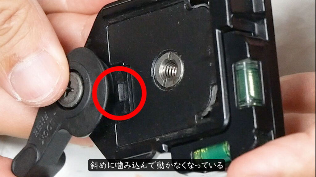 本来、プレートを外した状態ではレバーが「待ち」の状態でロックされるはずなのですが、プレートを感知するボタンが斜めに噛み込んでしまい、動かなくなっているのが原因でした。