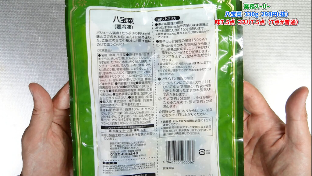 業務スーパーで見つけた冷凍の八宝菜、価格は298円で内容量は330gです。調理方法は、凍ったままの袋を沸騰させたお湯に入れて温めるだけなので非常に簡単です。