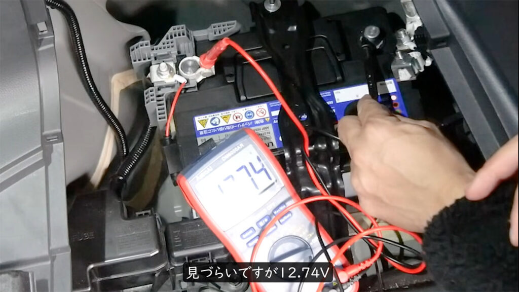 5年ほど使用した古いバッテリーは電圧が12.07Vまで低下していましたが、新しいバッテリーは12.74V。