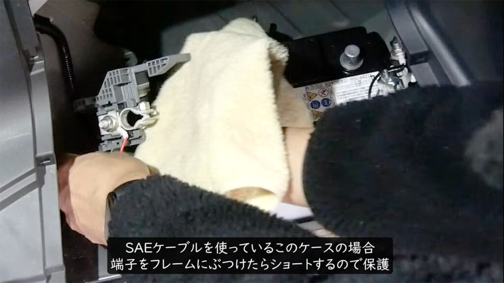 自分の場合はSAEケーブルでサブバッテリーを接続しているので端子がフレームに当たらないように保護して作業しました。