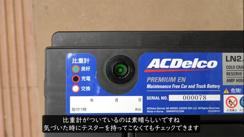 さらに、このバッテリーには液量や充電状態を確認できる比重計が付いています。