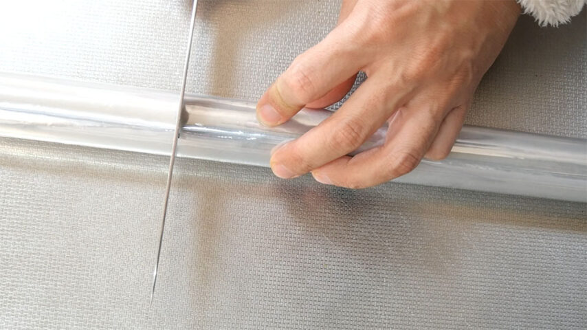 • プリンタの長さで包丁でカット プリンタの長さの位置にマークをしたら可能な限り垂直になるように包丁でテーブルクロスを回転させながら何周も押し付けてカットします。
