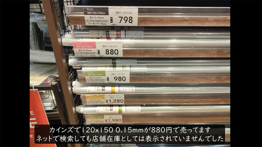 今回の対策で使用したのは、カインズのテーブルクロス(120cmx150cmx01.5mm)です、ネットでは表示されない(配送のみ)ですが実店舗にはバリエーション豊富に在庫が有ります。